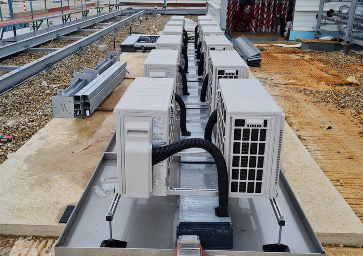 Das Unternehmen Klimageräte Großhandel Ketzler (KGK) aus Waldfeucht-Braunsrath im Kreis Heinsberg (NRW) übernahm die Lieferung und Installation der Kleinkälte für die Technikräume – insgesamt 41 Klimageräte vom Typ MJ09 PC (2,5 kW) und MJ12 PC (3,4 kW), jeweils in Kombination mit der Außeneinheit UUA1 UL0. Die Vorinstallation startete im August 2021, abgeschlossen wurde die Installation im Januar 2022.