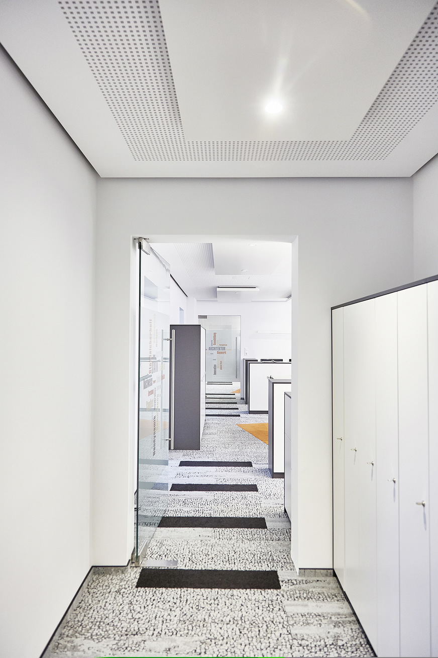 „Dank ihrer Vielseitigkeit und des Komforts waren die Deckensegel von Frenger Systemen für uns erste Wahl“, so Architektin Isabel Podufal-Wiehofsky und Geschäftsführerin des gleichnamigen Planungsbüros. „Sowohl in den kleineren Büros, dem Aufenthaltsraum als auch in der ehemaligen Turnhalle, die wir zum Großraumbüro umgebaut haben, passt sich die Optik der Deckensegel wunderbar in das komplette Raumdesign ein“.