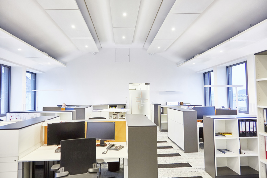 Angeschlossen an eine Gasmotorwärmepumpe schaffen moderne Deckensegel in den kleineren Räumen und dem in der ehemaligen Turnhalle eingerichteten Großraumbüro im Winter eine angenehme, gleichmäßige Wärme. Im Sommer sorgen die Deckensegel und zusätzliche Kühlkonvektoren für eine effektive und geräuschlose Kühlung.