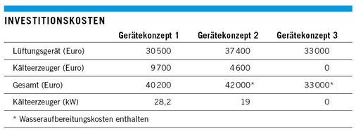 Angenommen wurden für alle Varianten Zentrallüftungsgeräte mit 10000 m³/h Luftleistung (bei 1,8 m/s im freien Querschnitt; Rückwärmzahl trocken 68,3 Prozent) mit freilaufenden Rädern und EC-Motoren. Sie sollen von Montag bis Freitag jeweils zwischen 7:00 und 22:00 Uhr eine Zulufttemperatur von 20 °C herstellen. Bei GK 1 wird ein Direktverdampfer mit einer Kühlleistung von 28,2 kW vorausgesetzt, bei GK 2 ein Gerät mit 19,0 kW mechanischer Kühlleistung.