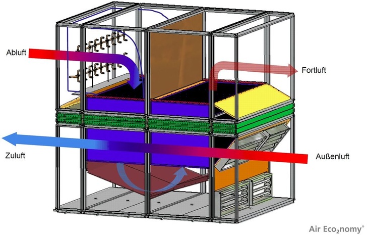 Da die adiabate Kühlung in der Abluftstrecke stattfindet und der Zuluft die Wärme via Plattenwärmeübertrager entzogen wird, sind die Luftströme hierbei getrennt und ein hygienischer Betrieb gewährleistet. Da die ERG Bestandteil des Kühlkonzeptes ist, nannten die Entwickler ihre Lösung ECOTWINcool. Erhältlich sind Zentrallüftungsgeräte GEA CAIRplus mit ECOTWINcool bis Bauhöhe 1280 mm pro Geräteteil, was einem maximalen Luftdurchsatz von etwa 23000 m³/h (bei 2 m/s im Gerät) entspricht.