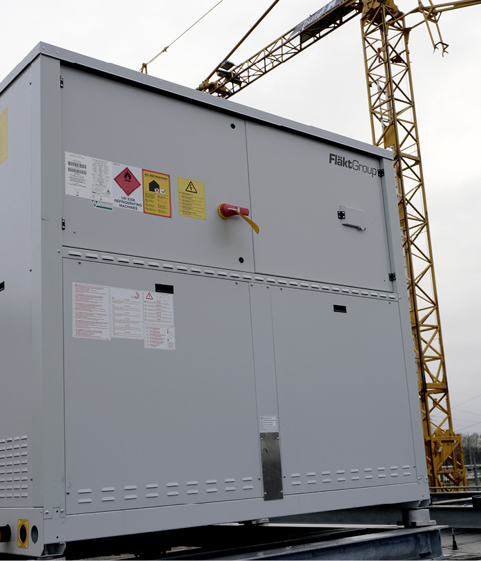 Die Be- und Entlüftung mit je 16 000 m³/h wird über ein Zentrallüftungsgerät des Typs CAIRplus von Fläkt Group realisiert, welches mit einem Kreislaufverbundsystem und zwei zusätzlichen wassergeführten Wärmetauschern als Kühler und Erhitzer ausgestattet ist. Der Kaltwassererzeuger FGAC4081BG2.SL von Fläkt Group ist mit vier Scrollverdichtern des Herstellers Bitzers ausgestattet, die auf zwei getrennten Kältekreisen arbeiten. Das Gerät ist als Super-Leise-Version (SL) ausgeführt und erreicht Schallleistungswerte von 83 dB(A) bzw. 51 dB(A) Schalldruck in 10 m Entfernung. Durch optionale EC-Ventilatoren wird die Effizienz im Sinne des SEER-Wertes auf 4,43 gesteigert. Das Gerät wurde im Jahr 2020 geliefert und übertraf schon zu diesem Zeitpunkt deutlich die Anforderungen der ErP-Stufe des Folgejahres. Zur Reduzierung der Anlaufströme wurden alle Verdichter mit Softstartern ausgestattet. Die Kommunikation mit Gebäudeleittechnik erfolgt über eine BACnet over IP-Schnittstellenkarte. Weiteres Installationszubehör wie Filter, Strömungswächter und Schwingungsdämpfer gehörten ebenfalls zum Lieferumfang.