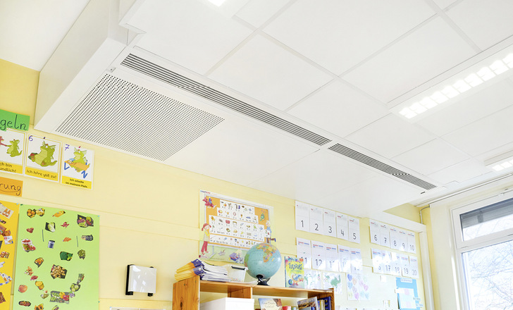 Das dezentrale Lüftungsgerät Schoolair - D-HV wird mit geringem Einbau-Aufwand sichtbar im Raum installiert. Das Wirtschaftsministerium fördert den Neueinbau von stationären Frischluft-Klimaanlagen in Kindergärten, Grundschulen und z.T. weiterführenden Schulen zu 80 %. Das Deckengerät sorgt in Klassenräumen, Lehrerzimmern und Kindergärten für permanente Frischluftzufuhr. Das Gerät verfügt über einen Rotationwärmerückgewinner, womit die Leistung der Heizungsanlage somit kleiner dimensioniert werden kann. Die Rotationswärmerückgewinner sind Kondensationsrotoren und erzeugen im Winter Kondensat auf der Abluftseite, das auf der Zuluftseite sofort wieder verdampft. Mit dieser Feuchterückgewinnung verhindern die Geräte die Austrocknung der Raumluft.