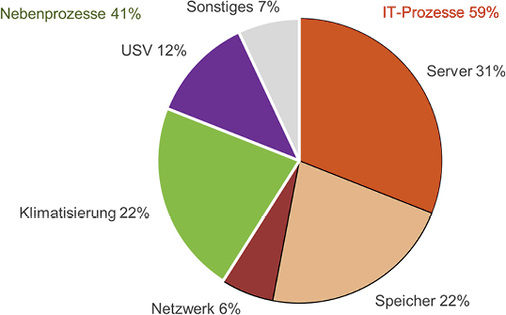 Bild 2 zeigt beispielhaft die Verteilung des Stromverbrauchs. In den letzten Jahren hat der Anteil der IT-Prozesse zugenommen, weil vor allem der Anteil der Klimatisierung bzw. Kälteerzeugung reduziert wurde.
