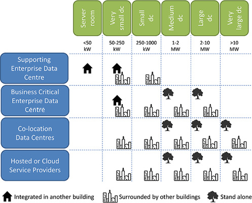 Rechenzentren übernehmen verschiedene Aufgaben (z. B. wissenschaftliches Hochleistungsrechnen, Webservice, Geschäftsprozesse, Speicherung bzw. Archivierung). Mit der Aufgabe ist oft der Standort festgelegt (z. B. Bank in der Innenstadt). Es gibt aber auch große Rechenzentren (z. B. in Skandinavien für Suchmaschinen, soziale Netzwerke oder Cloud-Dienstleistungen 6 ), die zentral weltweite Anfragen abwickeln. Mit den Aufgaben entstehen entsprechende Strom- und Kühllasten. Im Projekt wurde folgende Systematisierung vorgenommen ( Bild 5 ): a) Rechenzentrum in einem Gebäude, b) Rechenzentrum als eigenständiges Gebäude in einem Bebauungsgebiet oder c) entfernt von Ansiedlungen. Die Fälle a) und b) zeichnen sich durch das Vorhandensein einer technischen Infrastruktur (Netzwerk, Stromversorgung, Kälte- und Wärmenetze) aus. Jedoch kann die Anwendung von erneuerbaren Technologien eingeschränkt sein (z. B. Aufständerungsfläche für PV-Module oder Solarkollektoren, Abstände zu Windgeneratoren, Emissionen bei Biomassetechnologien, hochpreisige Grundstücke in Innenstädten, Entfernung zu Seen für Kühlzwecke). Bei unbebauten bzw. ländlichen Standorten können diese Probleme umgangen werden, jedoch sind die Bedingungen für die Anbindung an eine städtische Infrastruktur (z. B. Fernwärme) sehr schlecht.