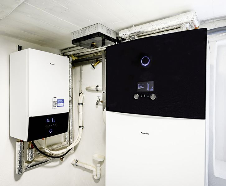 Bei den gewählten Niedertemperatur-Wärmepumpen handelt es sich um Split-Geräte. In der Erdgeschosswohnung ist die Daikin Altherma 3 R F für das Heizen und die Warmwasserbereitung zuständig. Die Entscheidung für diese Wärmepumpe fiel, da sich Lehwald eine hohe Trinkwasserqualität gewünscht hat. Die Daikin Altherma 3 R F vereint Edelstahl-Trinkwasserspeicher und Luft-Wasser-Wärmepumpe in einem Gerät. Der Brauchwasser- bzw. Wärmespeicher mit 250 Liter Fassungsvermögen befindet sich im Keller des Hauses. Für das Obergeschoss wurde ein wandhängendes Gerät der Daikin Altherma 3 R W gewählt, mit dem geheizt wird. Die Warmwasserbereitung im ersten Stock übernimmt ein Durchlauferhitzer. Mit Vorlauftemperaturen bis zu 65 °C und der effizienten Betriebsweise bei Außentemperaturen von bis zu -25 °C sind die Wärmepumpen sehr leistungsstark.