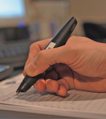Dank des Pens müssen Mitarbeiter Rechnungen nicht zusätzlich abschreiben. Außerdem kann ein Monteur beim Kunden vor Ort zeitnah ein Angebot für die erforderliche Leistung erstellen: Dazu muss er mit dem digitalen Stift auf einem Papier-Formular, das mit einer speziellen Rasterung versehen ist, seine Anfahrtszeit, die voraussichtliche Stundenzahl und eventuell benötigte Ersatzteile notieren. Die Daten werden digitalisiert und mithilfe des Diensthandys an das Büro gesendet.
