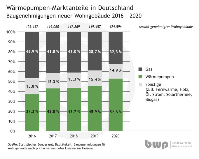Im vergangenen Jahr sind nach Angaben des Statistischen Bundesamts insgesamt 124 596 Wohngebäude für den Bau genehmigt worden. Davon sollen 55 544 mit Umweltwärme und 10 257 Gebäude mit Erdwärme beheizt werden – insgesamt sind das 52,8 Prozent der genehmigten Wohngebäude, so der Bundesverband Wärmepumpe (BWP) e. V. Dabei wurden 10 257 (8,2 Prozent) Gebäude mit Geothermie genehmigt sowie 55 544 (44,6 Prozent) mit Umweltthermie. Im Jahr 2019 heizten 45,8 Prozent der Gebäude mit Umweltwärme. Mit fossilem Erdgas betrieben wurden im Jahr 2020 noch 40 279 der neu genehmigten Wohngebäude, was einem Anteil von 32,3 Prozent entspricht.