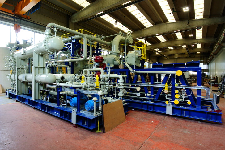 Diese Anlage basiert auf einem ölgefüllten Schraubenkompressor. Das Öl wird in zwei Ölabscheidern (Haupt- und Endabscheider) vom Abgas getrennt, um ein Gas mit weniger als 1 ppm Ölgehalt zu bekommen. Als ölgefüllter Schraubenkompressor ist der Ölkreislauf für die Schmierung der Innenteile des Schraubenkompressors vorgesehen. Der Ölkreislauf besteht aus zwei Ölpumpen (eine in Standby), einem Druckregelventil, um den Öldruck konstant zu halten, und einem elektropneumatischen Drei-Wege-Regelventil, um den Ölfluss zum Kompressor auf einer festen Temperatur zu halten. Der Ölkreislauf besteht aus zwei Ölkühlern (einer im Standby-Betrieb) mit einer gemeinsamen Zu- und Ablaufleitung für das Kühlwassersystem. Das abfließende Öl mit hoher Temperatur, das im Ölabscheider aufgefangen wird, wird mit Kühlwasser als Medium abgekühlt.