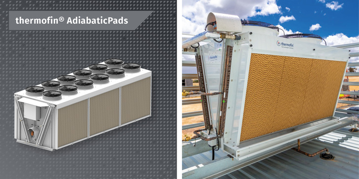 Sobald aufgrund von steigenden Umgebungstemperaturen die benötigte Leistung im Trockenbetrieb nicht mehr erreicht wird, wird die adiabate Vorkühlung aktiviert. Die dem Wärmeübertrager vorgeschalteten AdiabaticPads werden befeuchtet. Abhängig von deren Ausführung und dem Luftzustand am Eintritt des Kühlers, kann die Luft um mehr als 10K abgekühlt werden, bevor Sie in den Wärmeübertrager eintritt. Die Kühler des Herstellers sind mit dem SystemTCS zur Überwachung, Regelung und Datenaufzeichnung ausgestattet. Es beinhaltet alle notwendigen Programmbausteine und Anschlussmöglichkeiten unter anderem zur Regelung der Ventilatordrehzahl, zur Pumpenansteuerung sowie zur Wasserhaltung und Wasseraufbereitung. Das adiabatic management des Herstellers lässt zudem eine wassersparende Betriebsweise zu, indem die Benetzungswassermenge durch ein Regelventil bedarfsgerecht gesteuert wird.