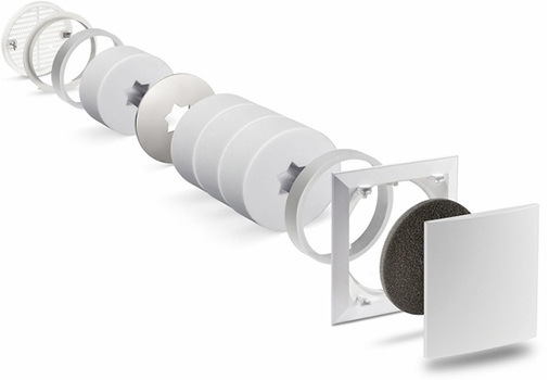 Eingebaut wird der Einschub in den Rundkanal 9/R 160 mit einem Durchmesser von 160 mm in der Außenwand; die Mindesteinbaulänge beträgt 180 mm. Wird die volle Rohrlänge von 500 mm genutzt, sollten zwei zusätzliche Schalldämpferelemente verwendet werden. Damit eventuell eingetretenes Regenwasser wieder ablaufen kann, sollte außerdem auf ein leichtes Gefälle des Kanals nach außen von ein bis zwei Prozent geachtet werden. Der Luftdurchlass lässt sich auch mit anderen Außenhauben des Herstellers kombinieren und kann bei Bedarf mit einem Pollenfilter ausgestattet werden, damit auch Allergiker durchatmen können.