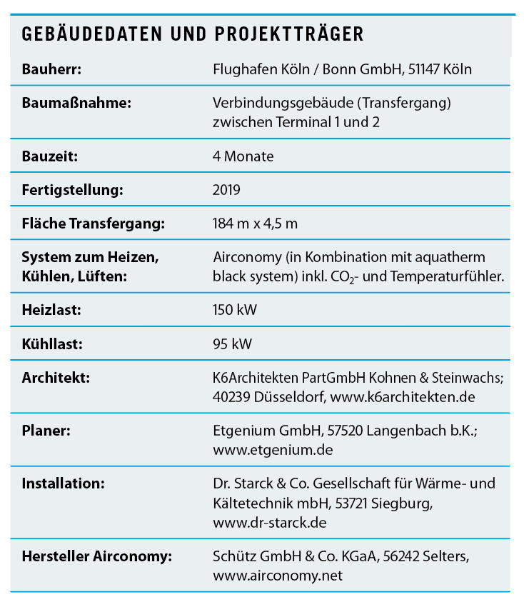 Der Flughafen Köln/Bonn entschied sich schließlich für das System Airconomy von Schütz. Dieses Komplettsystem kombiniert eine Warmwasser-Fußbodenheizung mit einer kontrollierten Be- und Entlüftung mit Wärmerückgewinnung und integrierter Kühlfunktion. Durch das Zusammenwirken der Heiz- und Lüftungsfunktion in einem System spart Airconomy im Gegensatz zur Kombination von Einzellösungen Zeit und Kosten.