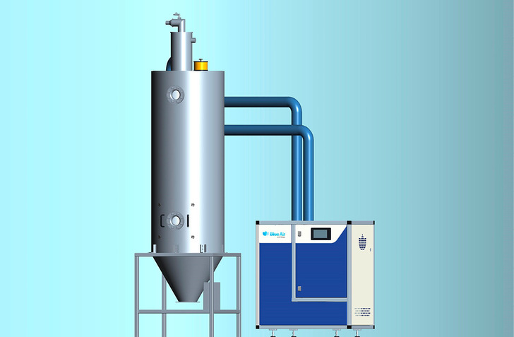 Blue Air Systems hat das Modul BBX zur energieeffizienten Umrüstung von Granulattrocknern entwickelt. Es ersetzt die Trocknungseinheit konventioneller Systeme, während die vorhandenen Granulat-Behälter weiterverwendet werden können. Die Technologie basiert auf trockener Prozessluft anstelle von erwärmter Luft, wie sie bei Adsorptions- oder Molekularsiebtrocknern üblich ist. Dadurch entfallen Regenerationsenergie, der Bedarf an Kühlwasser und der Einsatz von Molekularsieben. Laut Hersteller sind Energieeinsparungen von 50 bis 70 % möglich. Die Module sind für Prozessvolumina von 0,5 bis 10.000 kg/h ausgelegt; bei PET-Anwendungen sind Durchsätze bis 1000 kg/h standardmäßig realisierbar, höhere auf Anfrage. Eine Steuerung mit Digital-Pneumatik regelt den Volumenstrom der Prozessluft bedarfsgerecht. Optional ist eine Datenbank für kunststoffspezifische Trocknereinstellungen und eine Füllstand-Sensorik erhältlich. Standardmäßig zeigt das System Prozessparameter wie Temperatur, Trockenluft-Volumenstrom, Taupunkt und Energieverbrauch an. Die Wartung beschränkt sich auf den Austausch des Luftfilters. Die Installation ist als Plug-and-Play-Lösung konzipiert. Das zum Patent angemeldete System ist für Anwendungen in der Spritzgießtechnik, Blasformtechnik und PET-Verarbeitung vorgesehen.