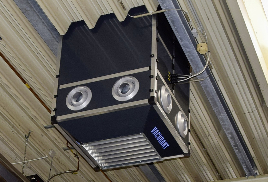 Realisierbar ist dieses System mit WRG per zentraler oder dezentraler Lüftung. Bei Ersterer ist eine Lüftungszentrale mit verzweigtem Luftkanalnetz erforderlich, bei der Alternative werden dagegen mehrere lokale Lüftungsgeräte in die Dachhaut eingebunden. Ein Luftkanalnetz entfällt, was die Planung vereinfacht und die Bauzeit verkürzt. Eine solche dezentrale Lösung für die Hallenklimatisierung ist beispielsweise das System VR3400 EVO von Vacurant.