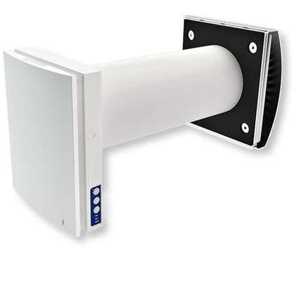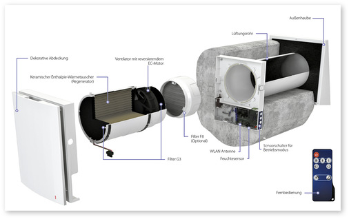 Die Anlage arbeitet paarweise im Verbund und sorgt für einen zügigen Austausch der Raumluft, wobei die gespeicherte Wärme über den Keramikwärmespeicher mit hexagonaler Wabenstruktur auf die einströmende Frischluft übertragen wird. In den Bädern erledigen Abluftventilatoren Cabrio Base, ebenfalls von Blauberg Ventilatoren, für den geräuscharmen Abtransport der verbrauchten und feuchten Luft. Sie arbeiten dank niedrigem Energiebedarf und automatischer luftdichter Verschlussklappe besonders effizient.