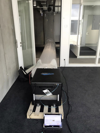Hierzu mussten die Brandschutzklappen zur Abtrennung der Stränge in den einzelnen Etagen geschlossen werden. Zudem wurde das Abdichtungsgerät mit den abzudichtenden einzelnen Steigschächten verbunden. Dies konnte über einen einzigen Anschlusspunkt erfolgen, einen Steigschacht im Dachbereich, über welchen alle weiteren Steigschächte über das Luftleitungssystem miteinander verbunden und somit zu erreichen waren.