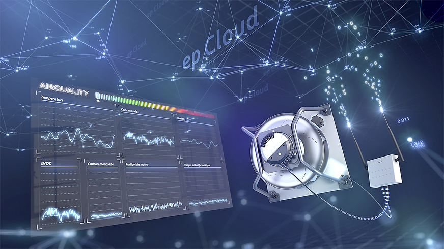 Eine intelligente Cloud-Plattform erlaubt es, gesundheitsrelevante Werte von Gebäuden und ihren Innenräumen zu überwachen und steuern. Ventilatoren von ebm-papst sammeln mithilfe von Sensoren Daten für die Plattform. Sie erfassen und verarbeiten mithilfe von Sensoren verschiedene Parameter, z. B. Drehzahl, Vibration, Geräusch, Luftgeschwindigkeit, Volumen, Druck und vor allem die Luftqualität. Die verbauten Luftqualitätssensoren gemäß dem RESET-Standard unterstützen eine präzise und vergleichbare Messung der Luftqualität. In der Plattform werden Daten verarbeitet, analysiert und dem Gebäudebetreiber zur Verfügung gestellt. Außerdem lässt sich so die Gebäudesteuerung optimieren. Algorithmen lernen aus Nutzerverhalten, Gebäudemerkmalen und Umweltbedingungen, so dass zusammen mit energiesparenden Ventilatoren ein Innenraum-Ökosystem entsteht. Zentrale und dezentrale Lüftungssysteme können so ertüchtigt werden, um die Luftqualität in Innenräumen zu verbessern und gleichzeitig die Energiekosten zu senken. Darüber hinaus lassen sich Luftwechsel und -reinigungsraten genau messen und steuern.
