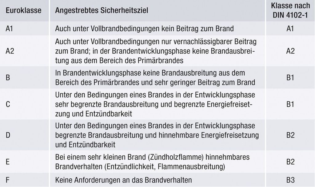 Im Jahr 2000 wurden in der Europäischen Union ein neues System für die Klassifizierung des Brandverhaltens von Bauprodukten, die Grenzwerte und die maßgeblichen Prüfverfahren eingeführt. Die harmonisierte Klassifizierungsnorm DIN EN 13501-1 unterscheidet die Brandklassen A1, A2, B, C, D, E, F. Das Bild 2 zeigt die neuen Euroklassen, das angestrebte Sicherheitsziel sowie ihre Zuordnung zur bisherigen Brandklassifizierung nach DIN 4102-1.