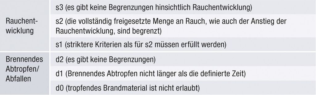 Um die Euroklassen für lineare Produkte (z. B. Dämmschläuche) von ebenen Produkten (Dämmplatten) zu unterscheiden, werden diese mit einem tiefergestellten L (Kurzzeichen L für linear) gekennzeichnet. Abhängig von ihrem spezifischen Brandverhalten werden Dämmschläuche also mit BL, CL, DL etc. klassifiziert. Für viele Länder neu ist auch die Prüfung der Rauchentwicklung und des brennenden Abtropfens. Hierfür wurden zusätzliche Klassen entwickelt, die mit s (Kurzzeichen s für smoke) und d (Kurzzeichen d für droplets) bezeichnet werden (s. Bild 3).