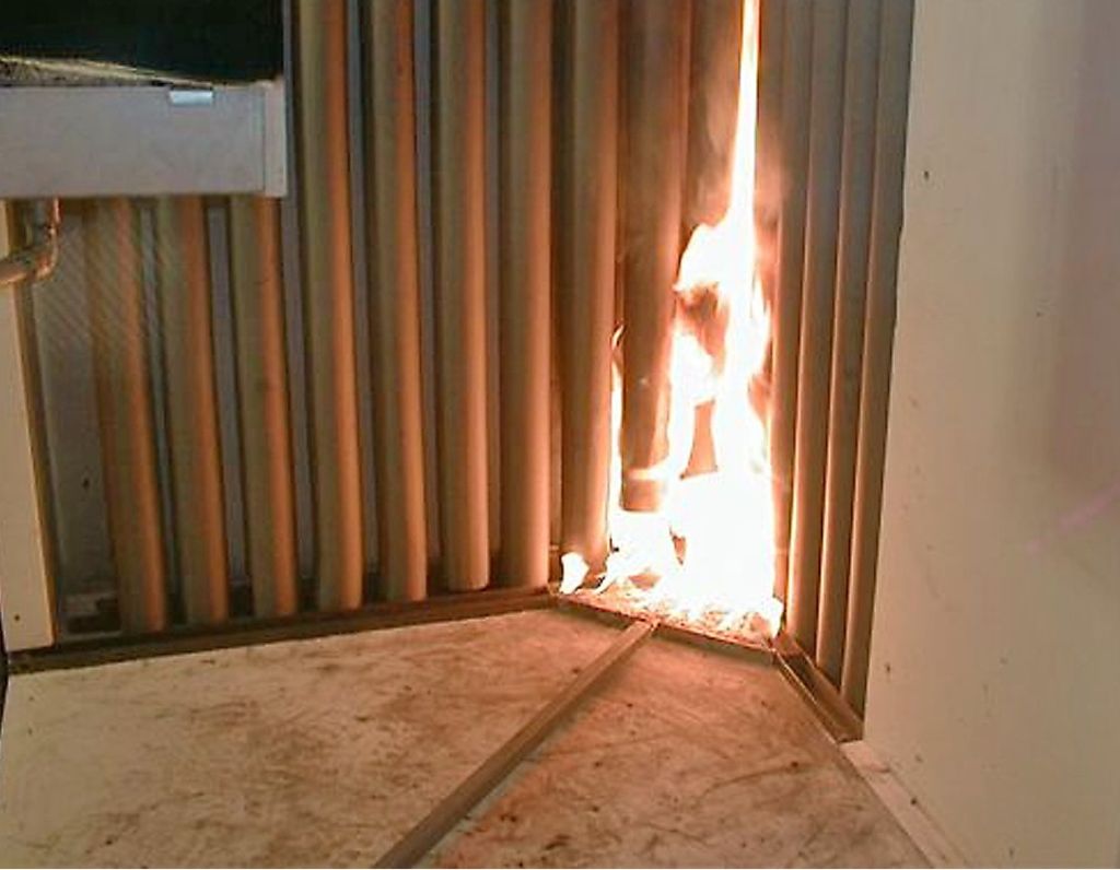 Der Entzündbarkeitstest bewertet die Entzündbarkeit eines Bauprodukts, indem es einer kleinen Flamme ausgesetzt wird. Beim SBI-Test wird der potentielle Beitrag eines Bauproduktes zu einem sich entwickelnden Brand bei einer Brandsituation bewertet, die einen einzelnen, brennenden Gegenstand (Single-Burning-Item: SBI) in einer Raumecke nahe an diesem Bauprodukt simuliert (Bild 4). Der Test stellt eine realistische Brandsituation nach, wie sie beispielsweise durch einen brennenden Papierkorb in einer Ecke des Raumes entstehen kann.