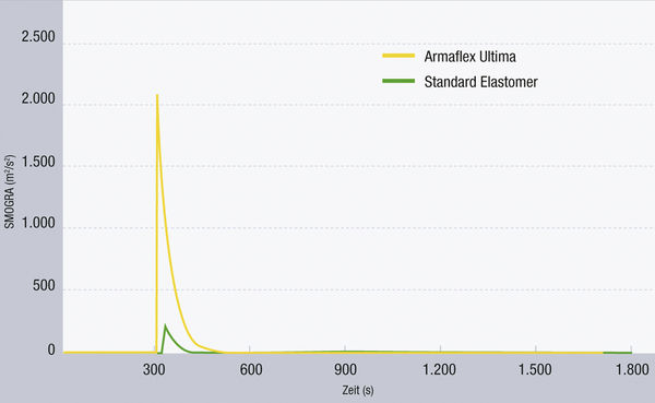 Wie das Bild 6 zeigt, weist Armaflex Ultima im Vergleich zu einem Standard- Elastomerprodukt eine 10-mal geringere Rauchentwicklung auf.
