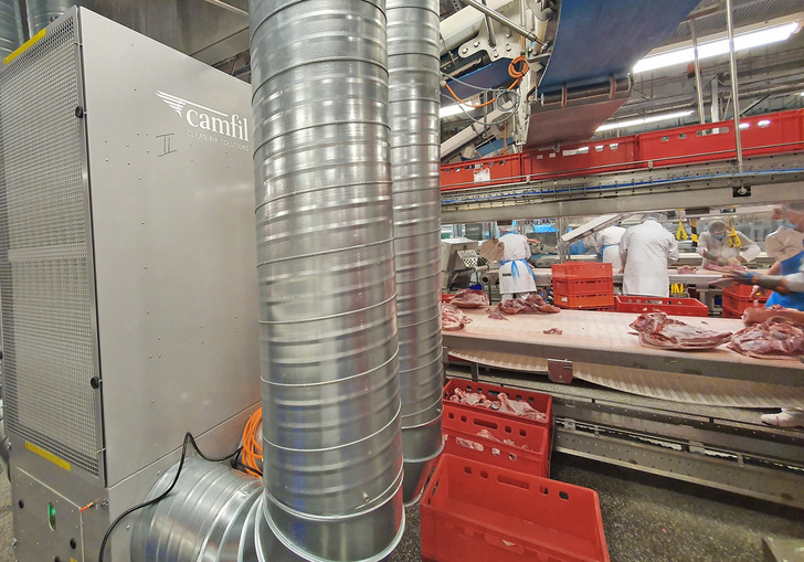 Um das Verbreitungsrisiko weitgehend auszuschalten, hat Camfil daher im Tönnies Hauptsitz den Bereich der Fleischzerlegung mit Luftreinigern CC 6000 und CC 2000 mit Hochleistungsfiltern HEPA H 14 ausgestattet. Hierdurch wird die Innenraumluft gereinigt, um sie von zirkulierenden Aerosolen / Viren zu befreien und somit wird nur diese hocheffizient gefilterte Luft den Kühlluftanlagen zugeführt, die diese gereinigte Luft in den Raum zurückführt. Die Belastungen in den Produktionsräumen im Bereich der Zerlegung sind dadurch auf ein Minimum reduziert und die Partikelkonzentration und Kontaminationen wirksam, entsprechend den Vorgaben, verringert.