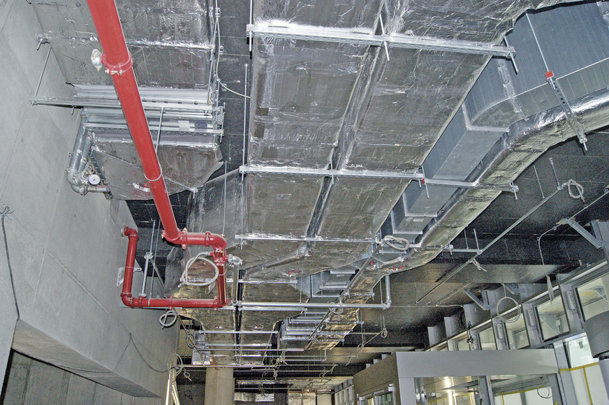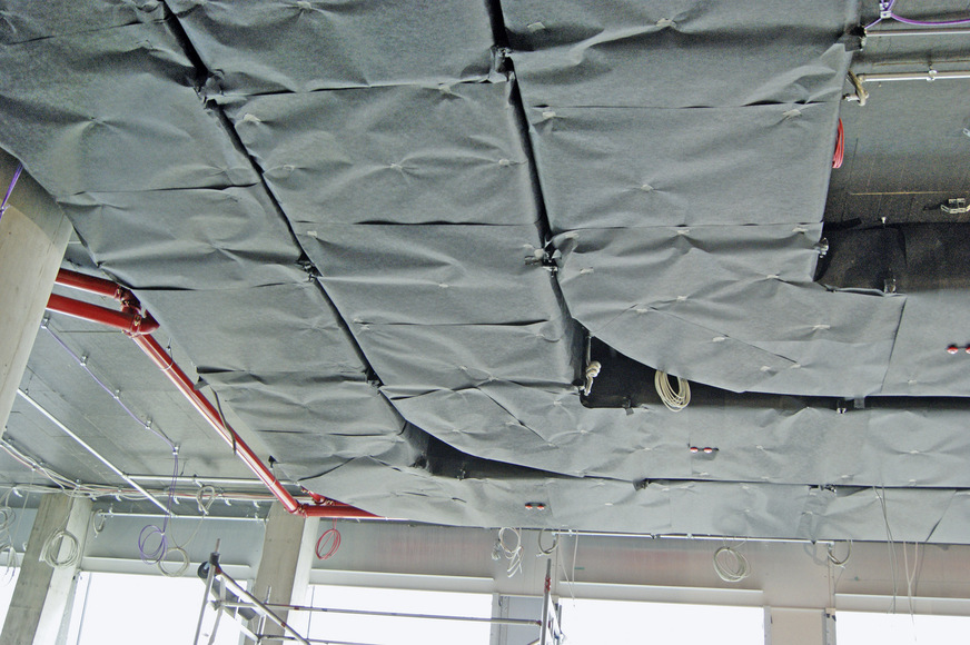Auch bei der Montage der Lamellenmatten wurden Emissionen in die Raumluft zuverlässig vermieden: Denn aus optischen Gründen sollte die Isolierung der Lüftungskanäle eine schwarze Oberfläche haben, da an vielen Stellen Metall-Lochdeckenelemente die Sicht in die Installationsebene erlauben. Bei ansonsten durchaus üblichen Beschichtungen der Aluminiumkaschierung mit schwarzer Farbe hätte man nicht vollständig ausschließen können, dass flüchtige organische Verbindungen, sogenannte VOCs, von dieser Farbe in die Raumluft abgegeben werden.