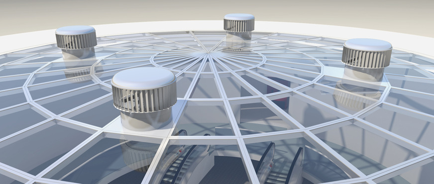Die Entlüftung von großen Industrie-, Produktions- und Lagerhallen mit Raumvolumen von mehr als 100.000 m³ und einem geforderten 6 bis 8-fachem Luftaustausch pro Stunde ist möglich, indem je nach Objektgröße und Nutzung auf der Dachfläche Ventilatoren EcoPower 900 montiert werden.