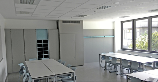 Sie wurden in den einzelnen Klassenräumen sowie Besprechungs- und Lehrerzimmern installiert. Die bodenstehenden Geräte mit ihrer geringen Einbautiefe von 600 mm ließen sich im Zuge der Sanierung in die Räume integrieren und fügen sich aufgrund ihrer individuellen Farbgestaltung nahtlos in das Raumambiente ein.
