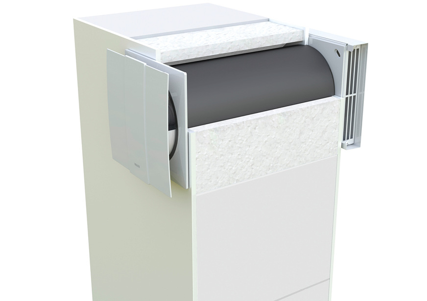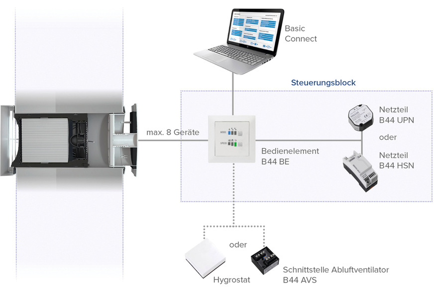 Für die Geräteinstallation sind Rohbaupakete erforderlich, die die Innenblende, das Bedienelement, Netzteil, Hygrostat etc. enthalten. Unter Verwendung von zwei Netzteilen können bis zu acht Geräte über das Bedienelement gesteuert werden. Man kann zwischen den drei Gerätefunktionen Normalbetrieb, Querlüftung und Zuluftbetrieb mit z.B. einem bauseitigen Abluftventilator wählen. Durch den Anschluss eines Hygrostaten lässt sich das System bedarfsabhängig steuern.