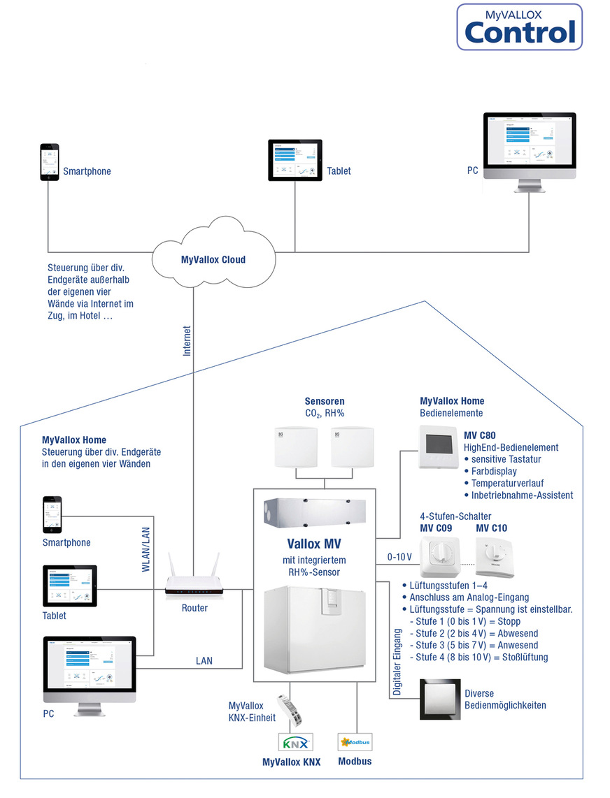Die Abkürzung MV bei der Geräteserie wiederum steht für die Steuerung MyValloxControl. Diese Smart-Home Steuerung eröffnet diverse Möglichkeiten und funktioniert über Internet / LAN / WLAN / KNX / Modbus. Als Ergänzung zum Bedienelement MV-C 80 benötigt der Anwender lediglich ein Endgerät wie ein Smartphone, Tablet oder PC.