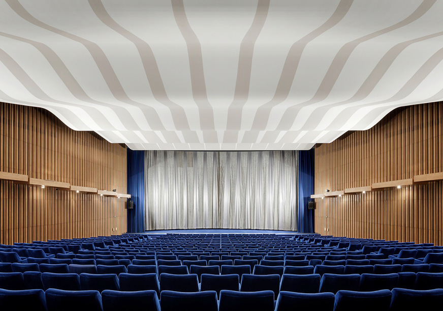 Die hölzerne Wandvertäfelung mit vertikaler Ausrichtung stellen jedoch klassische Behinderungen dar, um die Zuluft direkt zuzuführen. Kiefer Klimatechnik konzipierte daher eine Sonderbauform des Quell-Luftdurchlasses Induquell DIV der die geometrischen Vorgaben aufgreift und den Lufteintritt zwischen den Fugen der Vertäfelung ermöglicht. Die Luftauslässe unterstützen einen hohen thermischen Komfort durch geringe Luftgeschwindigkeiten und sanfte Luftverteilung. Durch die Beimischung der Raumluft können Untertemperaturen und somit auch Kühlleistungen abgedeckt werden. Die Zuluftversorgung der Saalmitte organisieren Weitwurfdüsen, welche im oberen Bereich der Wandverkleidung angebracht werden.
