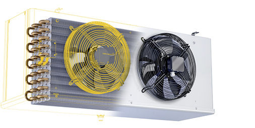 Die kompakten kubischen Luftkühler SG commercial classic von GEA Küba werden auch bei komplexen Kälteanwendungen wie Langzeitlagerung, der Absicherung von Reifeprozessen und dem präzisen Einhalten der Luftfeuchtigkeit eingesetzt. Zehn Gerätetypen (insbesondere für kleine und mittlere Kühlräume) decken einen Leistungsbereich von 0,7 bis 10 kW ab. Ihre ErP-konformen AC-Ventilatoren sind mittels Zusatzgerät drehzahlregelbar. Bei komplexen Anforderungen des Kühlguts geht es während des Kühlprozesses um mehr als nur um die Temperatur. Daher müssen die Geräte für nicht aggressive Umgebungsbedingungen große Flächen für eine geringe Entfeuchtung haben und bei Einsatzbedingungen wie einem häufigen Begehen des Kühlraums und somit ständigem Luftaustausch mit der Umgebungsluft nutzbar sein. Wird die Ware häufig entnommen und neue eingelagert, ist die Kälteleistung des Verdampfers so bemessen, dass eine gleichmäßige Temperaturverteilung gewährleistet ist. Der Luftkuhler erreicht dank seines fluchtenden Rohrsystems eine geringere Entfeuchtung als ein Standard-Luftkühler mit versetztem Rohrsystem. Das Anwendungsspektrum reicht je nach Konfiguration von der Normalkuhlung bis hin zur Tiefkühlung bis 25 °C Raumtemperatur. Alle Gehäuseteile haben durch die lebensmittelechte und umweltfreundliche Pulverlackbeschichtung eine kratz-, stoß- und korrosionsgeschützte Oberflächenstruktur und lassen sich einfach reinigen. Die Deckenaufhänger bestehen aus Edelstahl.