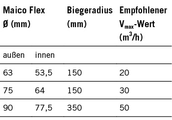 Die Verlegung in Abhangdecken ist mit allen Flexrohrnennweiten des Herstellers möglich (63, 75, 90 mm). Auch bei Betondecken kann das System MaicoFlex ver- legt werden, wobei vorher allerdings in jedem Fall ein Statiker konsultiert werden sollte.