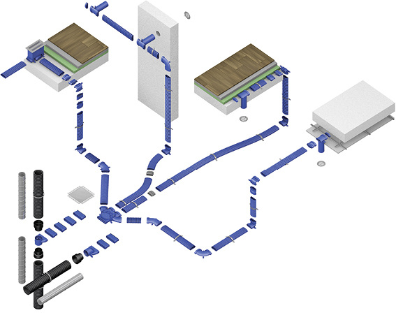 Das Flachrohrsystem FFS beispielsweise eignet sich für die wirksame Luftverteilung. Hauptkomponenten der Anlage sind die beiden Verteiler, von denen aus die Luft über die flexiblen Flachrohrleitungen in die Zu- und Ablufträume geführt bzw. abgeführt wird. Dank der Flexibilität und der einfachen Klick-Verbindung lässt sich das System einfach installieren und ist darüber hinaus besonders stabil. Aufgrund der geringen Aufbauhöhe ist es dabei vor allem für die Montage in der Dämmebene unter dem Estrich auf dem Rohfußboden geeignet.