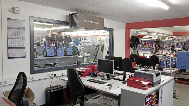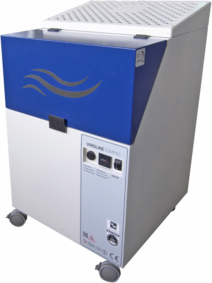Für größere Areale wie Großraumbüros, Umkleidekabinen, Fitnessstudios, Eingangshallen oder Wartebereiche eignet sich der Typ Viroline Maxi (665 x 681 x 1930 mm, B x T x H). Das Raumluftreinigungsgerät erreicht eine Absaugleistung von bis zu 1500 m³/h bei 50 dB(A). Die Umgebungsluft strömt von oben in das Gerät und wird durch eine Sektion mit UV-C-Lampe gelenkt. Anschließend bleiben Aerosole im H 14-Schwebstofffilter haften. Die gereinigte Luft wird an den Geräteseiten herausgeführt. Bereits im Abstand von 1 m ist kein störender Luftstrom mehr bemerkbar. Darüber hinaus lässt sich die Anlage über Industrierollen im Raum bewegen und so immer an der Stelle platzieren, an der ihr Einsatz am sinnvollsten ist.