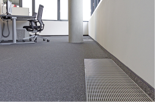 Zum Lüften und Temperieren hat Bauherr Hahn-Woernle den bislang selten praktizierten Ansatz favorisiert, statt einer Zentrallüftung lieber dezentrale, im Doppelboden eingebaute Lüftungsgeräte einzusetzen. Das spart Platz und nach seinen Erkenntnissen auf lange Sicht auch Geld. Die dezentralen Fassadengeräte sind zwar in der Anschaffung nicht günstiger, kommen aber mit weniger Energie aus als eine Zentrallüftung.