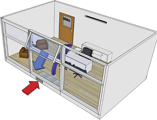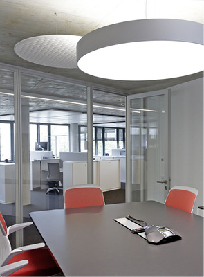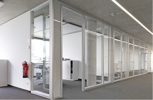 Eine individuellere Lösung verlangen Räume mit nur einem Fassadenlüftungsgerät. Hier ist sicherzustellen, dass der Luftraum des Zimmers mit dem Flur verbunden ist. In Gebäuden mit massiven Wänden kann dies zum Beispiel durch eine Überströmöffnung über der Türe ermöglicht werden. Im viastore-Neubau sind die Trennwände und Bürotüren jedoch aus Glas. Der Architekt wollte diese leichte Optik nicht zerstören. Daher wurden neben den Türen schmale, gläserne Überströmelemente eingeplant. Diese extra angefertigten, doppelwandigen Elemente erlauben den Luftaustausch, dämpfen aber mithilfe spezieller, extra für das Gebäude entwickelter Absorber innerhalb der Wände wirkungsvoll Geräusche.