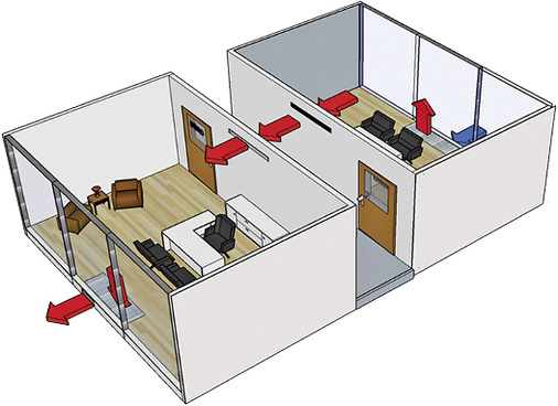 Die Großraumbüros und die offenen Flure werden von mehreren Fassadenlüftungsgeräten bedient. Eine Synchronisation der Geräte ist hier nicht erforderlich – sogar nicht erwünscht (siehe Kasten). Bei dichten Büro- und Besprechungsräumen mit zwei oder einem Gerät muss jedoch sichergestellt werden, dass ein angemessener Luftwechsel stattfindet und sich kein erhöhter Luftdruck im Raum aufbaut.