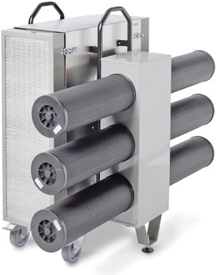 Den Luftreiniger CC 2000 gibt es als mobiles Gerät oder für die Boden-, Wand- und Deckenmontage. Er eignet sich vor allem für große Räume bis 300 m² Fläche und filtert unter anderem Staub, Schimmel, Asbest und ähnliche Stoffe. Zur Reduzierung von Rauch, Gasen und Emissionen sind Aktivkohlefilter als optionales Zubehör im Programm. Das 750 x 1070 x 260 mm große Gerät mit Vor- und HEPA-Filter erzeugt einen Volumenstrom bis 1600 m3/h.