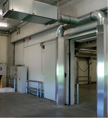 Beim Einsatz einer Luftwandanlage im Tiefkühl- und Kühlraum zur thermischen Trennung können sich die LWT-Module den baulichen Gegebenheiten anpassen. Dieses spezielle Problem einer thermischen Trennung besteht im Bereich von Türen und Toren (TK-Türen), insbesondere bei hohen Temperaturdifferenzen zur Außenluft. Häufiges Problem ist die Vernebelung und Vereisung bei geöffneten TK-Türen. In diesem Fall installiert LWT eine Doppelanlage, in der im Bereich der Öffnung die kalte Luft in bestimmte Luftstrahlwinkel durch eine Luftwandanlage zurückgedrängt wird. Gleiches gilt für die Warmluft auf der Außenseite durch eine weitere Luftwandanlage. Auf der Warmseite empfiehlt es sich, ein vorgekühltes und somit trockeneres Luftmilieu zu schaffen, um die Kondensation so gering wie möglich zu halten. Durch diese Grenzschicht-Spalte“ werden Temperaturverluste zuverlässig vermieden.