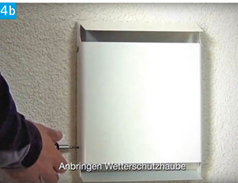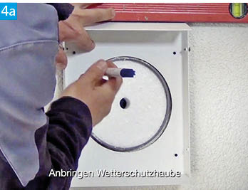 Nun erfolgt das Verschrauben der Wetterschutzhaube an der Fassade. Diese verhindert das Eindringen von Niederschlag in das Lüftungssystem. Zuerst wird die Grundplatte, danach die Abdeckung befestigt. Zur Vereinfachung kann die Grundplatte als Schablone für Bohrungsmarkierungen genutzt werden. Die Fugen zwischen Wetterschutzhaube und Fassade sollten anschließend versiegelt werden.