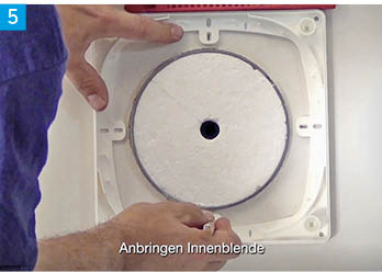 Zur Montage der Innenblende wird zunächst die Grundplatte mit der Innenwand des Wohnraumes verschraubt. In das zunächst noch abgedeckte Lüftungsrohr werden später der Keramikwärmespeicher sowie der Reversierventilator eingeschoben und angeschlossen.