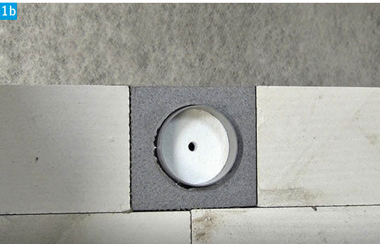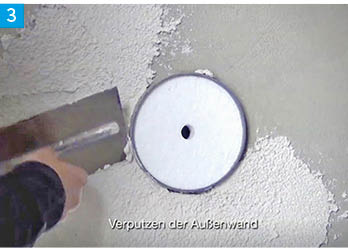 Der Unterputz wird angebracht. Eine Kernlochbohrung und die Installation der Wandeinbauhülse, welche mit einer 24 h andauernden Aushärtung verbunden wäre, entfallen. Um den Lüftungskanal vor Schmutz zu schützen, werden Styroporscheiben vor dem Einschäumen eingesetzt.