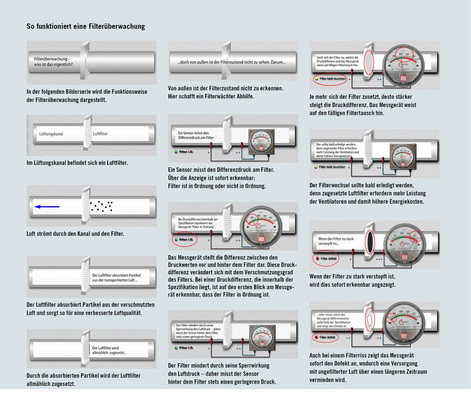 Schließlich werden Normen und Vorschriften mit größerer Sicherheit eingehalten. Mithilfe einer komfortablen Filterüberwachung ist der Filterzustand auf einen Blick erkennbar, auch aus der Distanz und an schwer zugänglichen Stellen. Sofern das entsprechende Messgerät beispielsweise mithilfe von Rot-/Grün-Bereichen auch international selbsterklärend funktioniert, ist eine hohe Überwachungssicherheit gegeben.