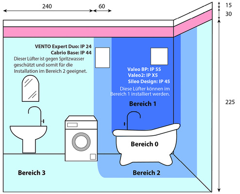 Gerade in Räumen, in denen Wasser und Strom zusammenkommen, sollten die Schutzklassen des jeweiligen Lüfters beachtet werden, um die Bewohner zu schützen. Die Schutzklasse besteht aus zwei Ziffern: Die erste Ziffer beschreibt den Schutz vor Berührungen, die zweite den Schutz vor Wasser. Bei den Schutzklassen gibt es verschiedene Einstufungen und Zonen, die definieren, welcher Lüfter wo verbaut werden darf. Ein Lüfter, der beispielsweise nur die Schutzklasse X 4 hat, darf nicht im Bereich 1 im Badezimmer direkt über der Badewanne verbaut werden. X 4 bedeutet, dass der Lüfter gegen Spritzwasser geschützt ist, aber nicht gegen Strahlwasser. Hier wäre die Schutzklasse X 5 nötig.