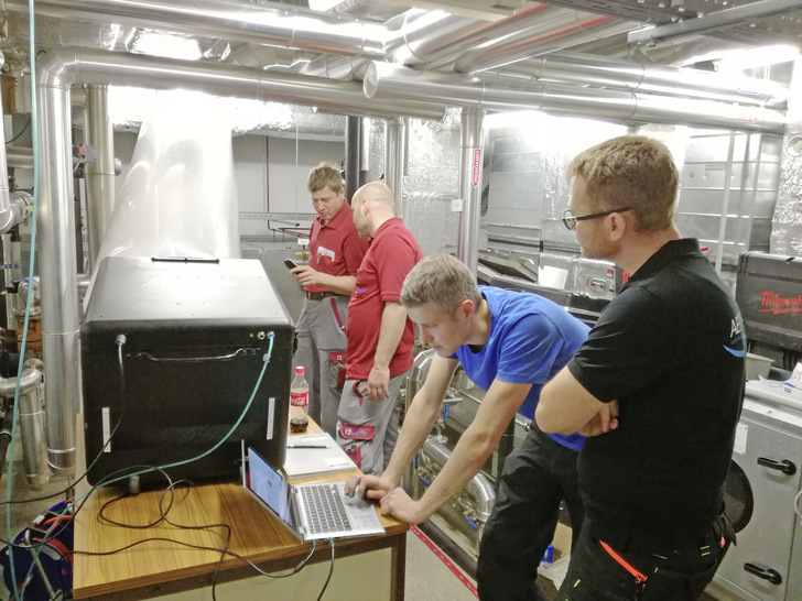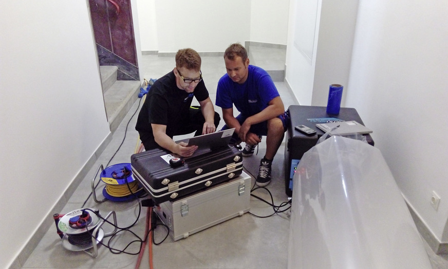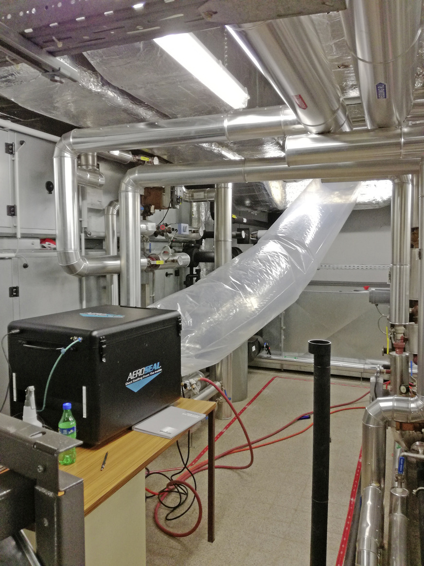 Um festzustellen, wie hoch die Leckageraten in den Bestandslüftungsleitungen sind, wurden die Luftkanalanschlüsse am Einlass des Lüftungsgeräts sowie an den Auslässen mit Blechplatten abgeschottet. Anschließend wurde das Abdichtungsgerät, das zugleich zur Leckagemessung dient, in der Lüftungszentrale aufgebaut und mit dem zu vermessenden Lüftungsstrang verbunden.