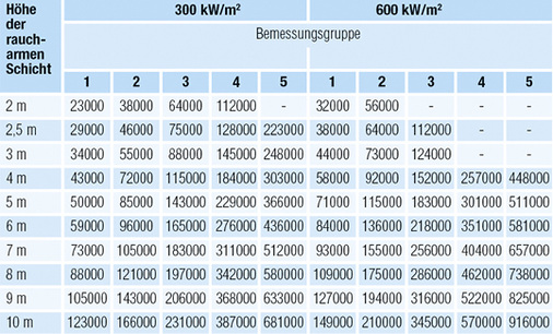 Der für den Rauchabschnitt (Standard 1 600 m2, erweiterbar auf max. 2 600 m2) abzuführende Rauchgas-Volumenstrom ist nach Tabellen zu ermitteln. In Abhängigkeit der Höhe der raucharmen Schicht, Wärmefreisetzungsrate und Bemessungsgruppe ist der Entrauchungsvolumenstrom darin vorgegeben. Die Norm unterscheidet hierbei zwei Wärmefreisetzungsraten (siehe Tabelle 2 ):