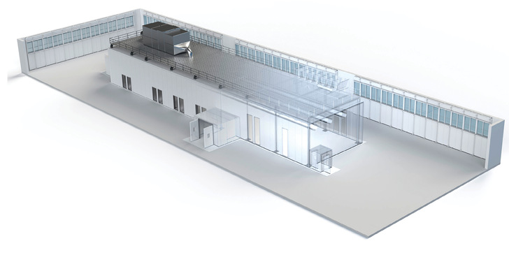 Um die erforderliche trockene Prozessatmosphäre zu gewährleisten, sind die Trockenräume vom umgebenden Produktionsgebäude luftdicht abgetrennt. In ihrem Inneren herrscht ein leichter Überdruck, der die Kammer vor dem Eindringen feuchter Außenluft schützt.