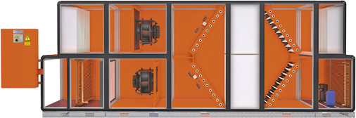 Das Wärmerückgewinnungssystem liegt für Gerätetiefen von 790 bis 3030 mm vor. Innerhalb des Gerätes kann der Rekuperator zusätzlich mit einem adiabaten Kühlsystem ausgerüstet werden, bei dem das Wasser direkt in den Abluftweg eingespritzt wird, im Rekuperator verdunstet und somit die Zuluft abkühlt. Die Zentralklimageräte beinhalten ein Steuerungs- und Regelungskonzept.